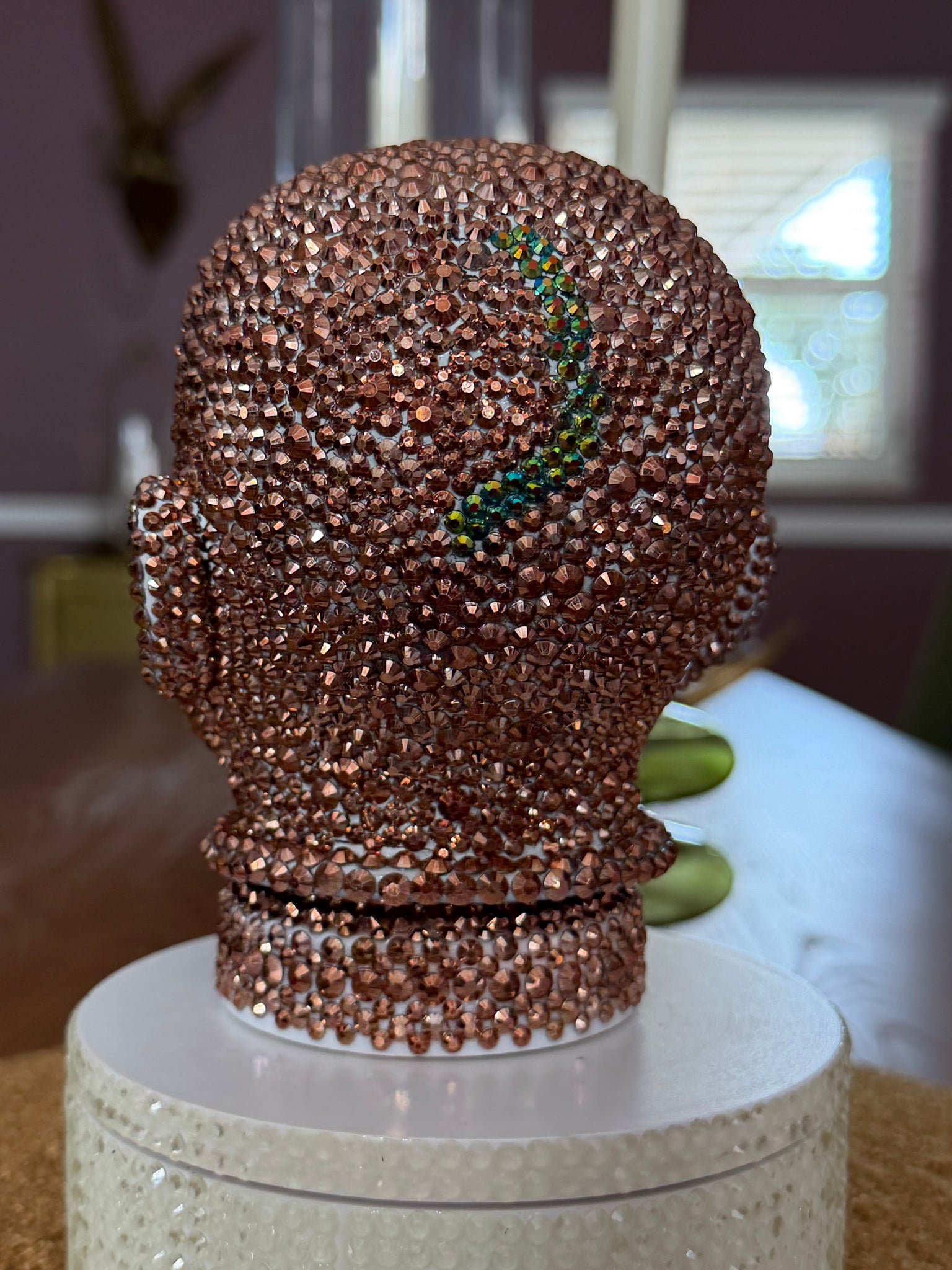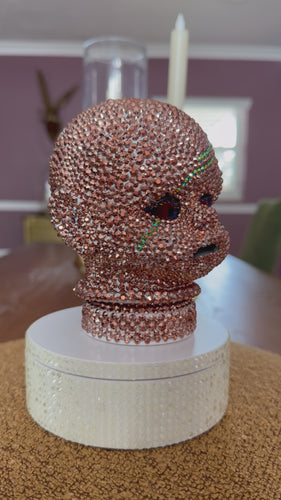 This doll is hand-decorated in 100's of sparkling copper rhinestone crystals; even her scar is blinged out. She stands about 5 1/2” tall and is completely one of a kind.