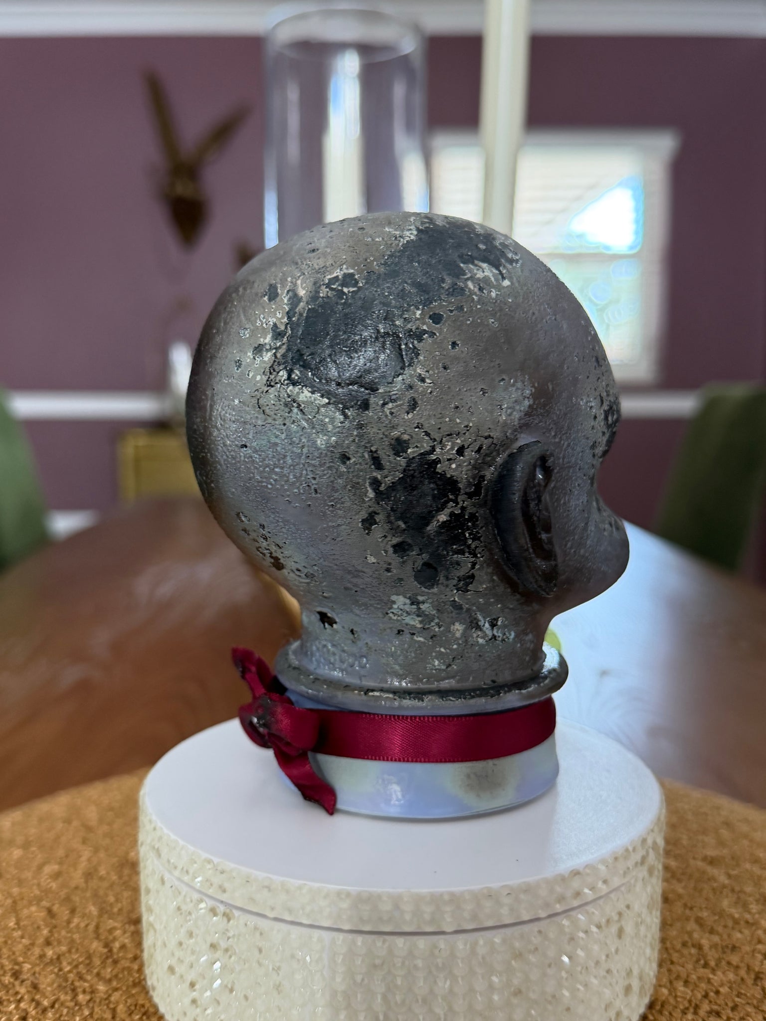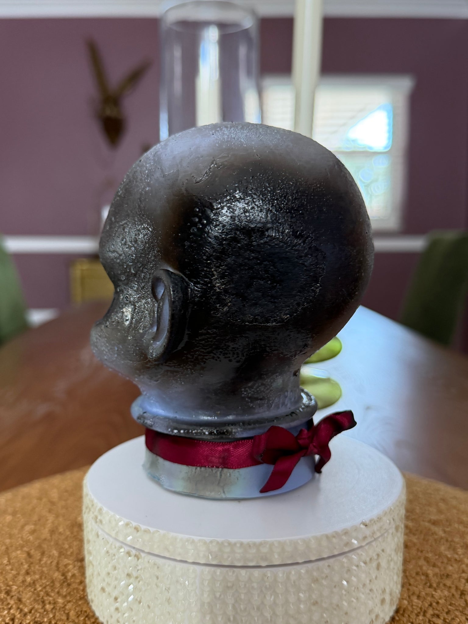 This doll is hand painted in a smoke gray and is perfectly charred. She is finished with a wine colored satin ribbon choker. She stands about 5 1/2” tall and is completely one of a kind.