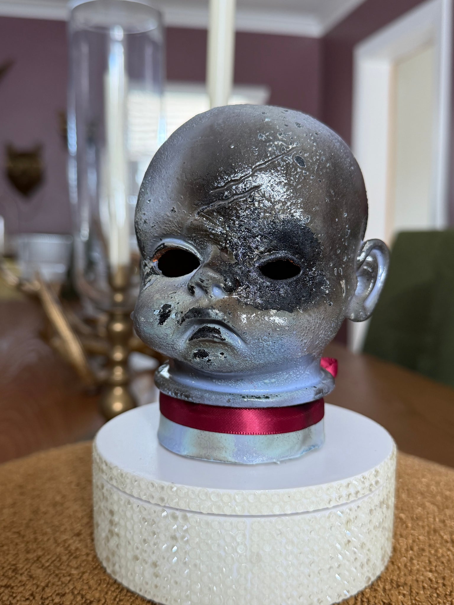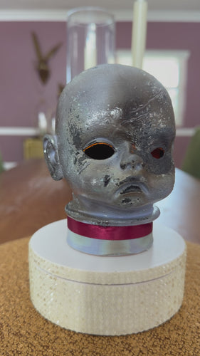 Handcrafted with high-quality materials, each piece begins with a perfect cherub baby doll head and a dual-function LED tea light featuring an on/off switch. The light offers a warm flicker or a delightfully eerie multicolored glow, powered by three included AAA batteries.