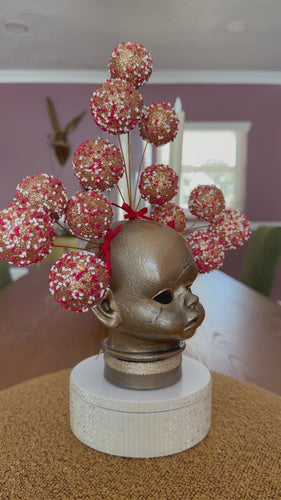 This doll is decorated with twelve sprinkled glittery cake pops protruding from her head, tiny red bows, and gold glitter ribbon choker. She shines in a beautiful gingerbread golden brown color. Standing about 11” tall and 10” wide. Each doll is a one-of-a-kind creation.
