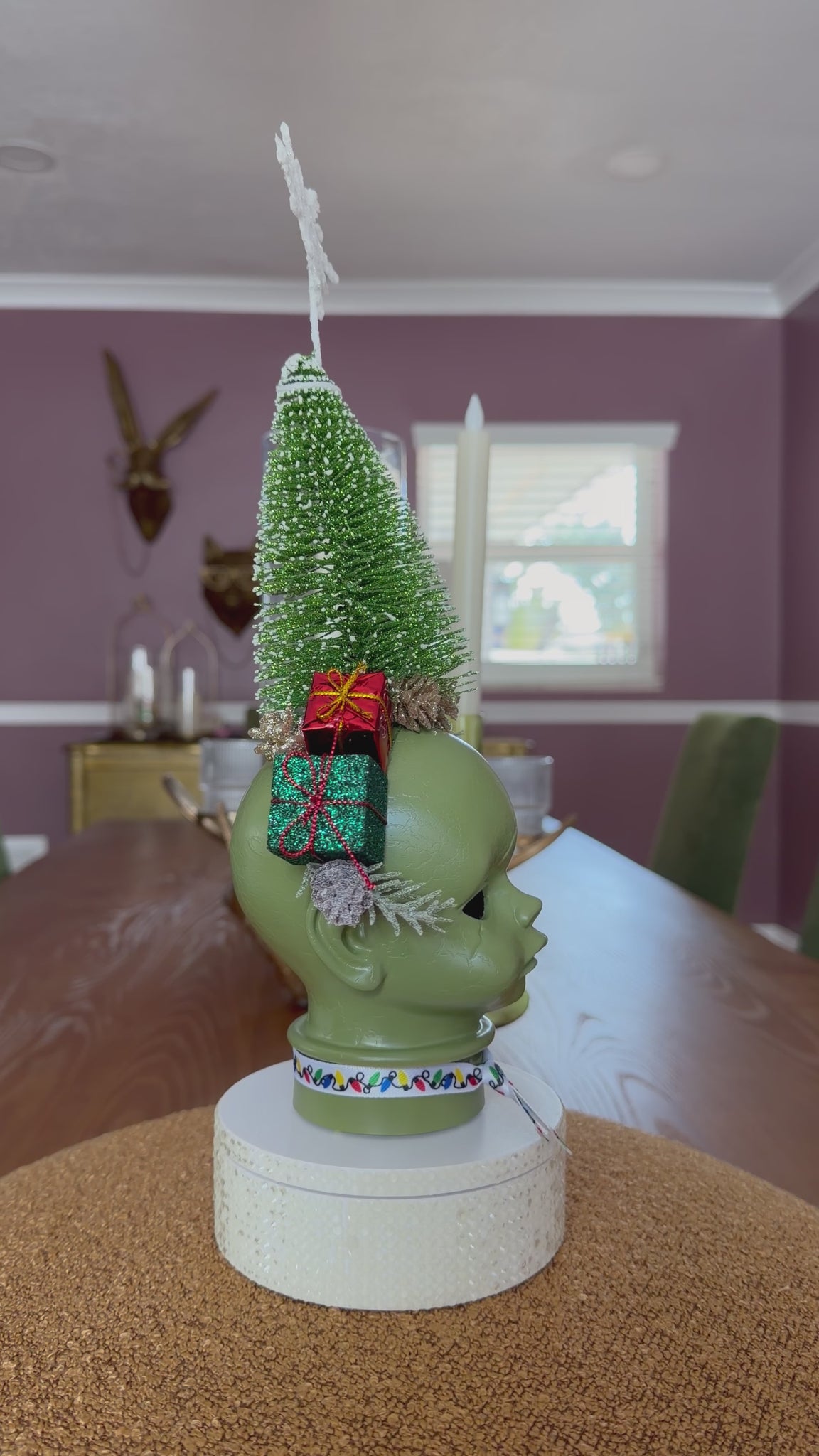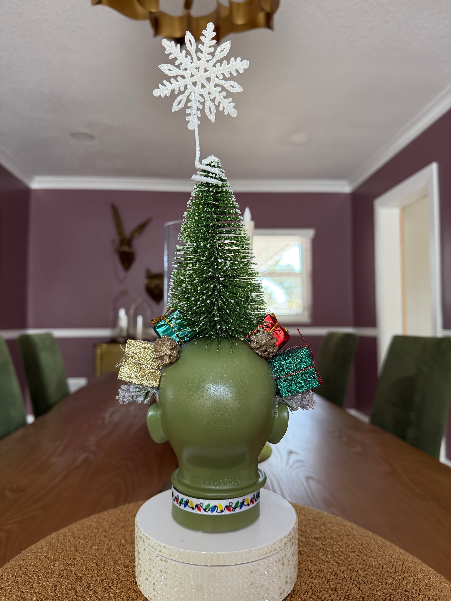 This doll is decorated with a giant star topped bottle brush glitter frosted Christmas Tree protruding from her head, multi colored wrapped Xmas gifts and acorns, and a cute holiday light printed ribbon choker. She is a stunning green and features a hidden little tree. Standing about 14” tall. Each doll is a one-of-a-kind creation.